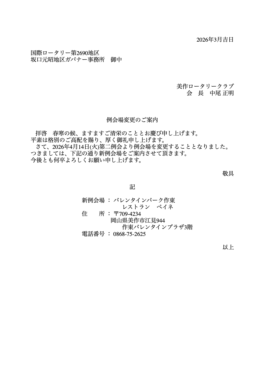2026.03.23 美作ロータリークラブより例会場変更のお知らせ Post Share Hatena Pocket RSS feedly Pin it Post Share Hatena Pocket RSS feedly Pin it 倉敷南ロータリークラブより例会変更・取りやめのお知らせ前の記事