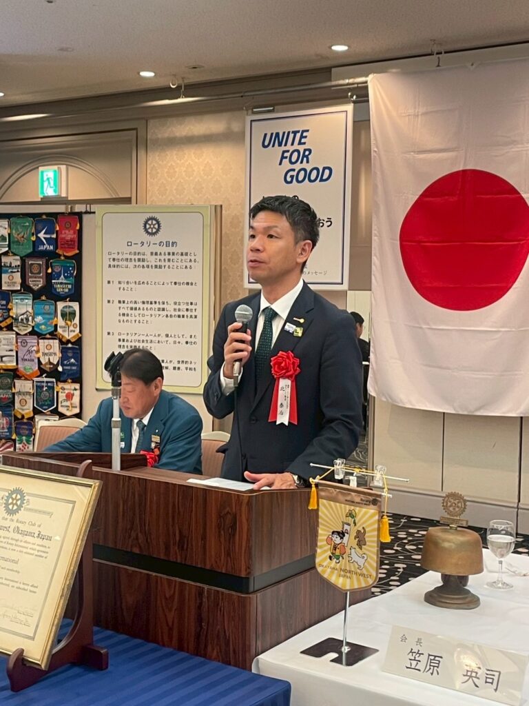 続く例会では、フランチェスコ・アレッツォRI会長のテーマ「UNITE FOR GOOD(よいことのために手を取り合おう)」に基づき、地区スローガンと9つの重点目標についてスライドを用いながらご講話をいただきました。