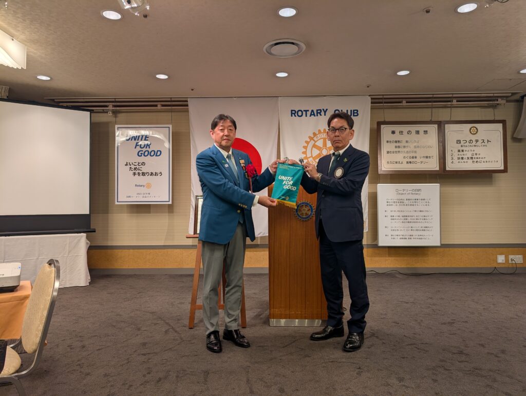 例会では、RI会長メッセージと第2690地区の重点地区目標並びにYouTube「坂口もとあきCHANNEL」についてご紹介頂き、ロータリー活動の存在意義とその魅力を再認識致しました。重点地区目標の一つである「地区大会in米子」への参加については、田中貴之地区副代表幹事より、大変魅力的な大会PRを頂きました。この度は、貴重な学びの時間を頂き、誠にありがとうございました。