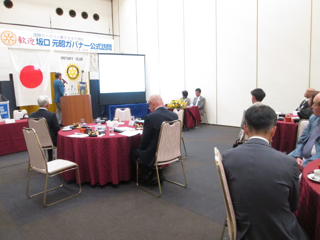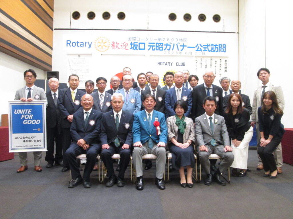 8月22日(金)、ダイヤモンド瀬戸内マリンホテルにて、2690地区ガバナー坂口元昭様、随行の地区幹事 足立珠希様、同行の地区代表副幹事 田中貴之様をお迎えし、ガバナー公式訪問例会を開催いたしました。