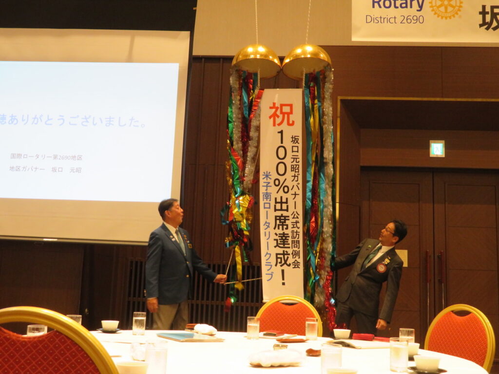 ガバナーが、公式訪問で久しぶりにホームクラブである米子南ロータリークラブに帰っていらっしゃる事。クラブの慶事として全員でお出迎えしましょう!と、松浦会長のお声掛けのもと、クラブ史上初めての100%出席例会をもって、ご帰還を祝うことも叶いました。坂口地区ガバナーと松浦会長御二人で、記念のくす玉を割って頂き、出席した会員全員で祝うことが出来ました。改めまして、ありがとうございました。