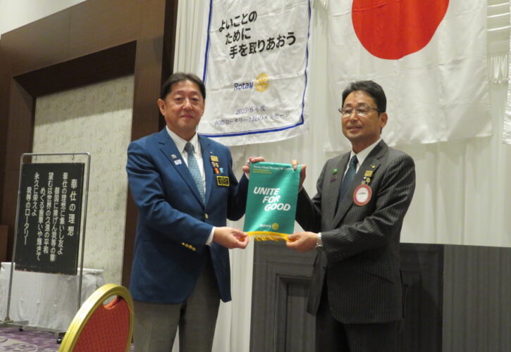 引き続き行われたガバナー公式訪問例会では、坂口地区ガバナーよりRI会長メッセージ「UNITE FOR GOOD(よいことのために手を取り合おう)」、第2690地区重点目標、並びにYouTube「坂口もとあきCHANNEL」についてご紹介いただきました。ロータリー活動の魅力を改めて実感しました。