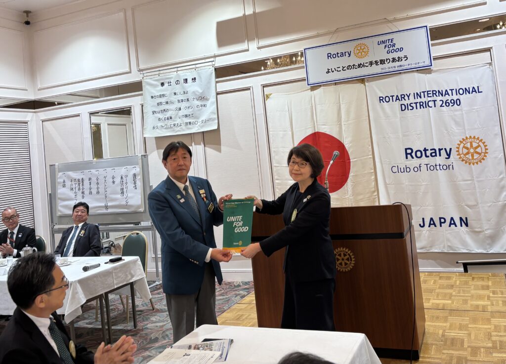 その後、小谷ガバナー補佐と懇談され、例会ではバナーを授与頂いた後、RI会長のメッセージ「UNITE FOR GOOD」を地区の9つの重点目標とともにご説明いただきました。ロータリー事業に際しては成長のキーワードとして革新・継続性・パートナーシップを取り入れること、青少年奉仕活動は今後の大きな柱になっていくこと、公共イメージ向上に努めていくことなどのポイントを押さえた卓話を頂戴しました。